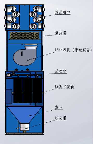 通過風機引力作用,車間廢氣經電動風口吸入設備進風口,設備進風口處設有阻火網,火花經阻火網被阻留,煙塵氣體進入沉降室,利用重力與上行氣流,首先將粗粒塵直接降至灰斗,微粒煙塵被濾芯捕集在外表面,潔凈氣體經濾芯過濾凈化后,由濾芯中心流入潔凈室,附著在濾芯表面的微粒煙塵經反吹系統的反吹做用使微粒煙塵落入灰斗。潔凈氣體經風機室,到達空調室,使潔凈氣體升至(或降至)系統預設溫度,在經設備頂部球形噴口的射流作用,把已達到預定溫度的潔凈氣體送入車間12m范圍內。