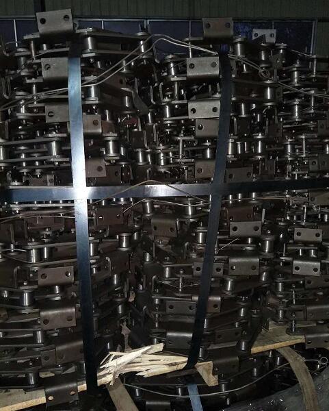 為搬運(yùn)和安 裝方便,出廠時(shí)山東金鑫鏈條廠將4米左右的提升機(jī)板鏈鏈條ne串接為一組,安 裝時(shí)先打開尾部檢修口蓋及中部檢修口蓋,將板鏈鏈條ne正確的(四孔板相對(duì))從尾部或中部檢修口逐組連接后用手拉葫蘆分別將兩條同側(cè)牽引鏈條從提升機(jī)機(jī)殼內(nèi)往上吊裝。牽引鏈條繞過頭輪后將其連接。用另一只手拉葫蘆將尾部鏈輪總成提到其可調(diào)范圍的最上端,使板鏈鏈條ne繞過尾輪后連接。放下尾輪總成,這時(shí)尾輪尚未利用的張緊行程應(yīng)不小于全行程的50%。如發(fā)現(xiàn)太高或太低,應(yīng)在最后接頭處,加入或卸下 2 節(jié)牽引鏈條,然后再行調(diào)整。