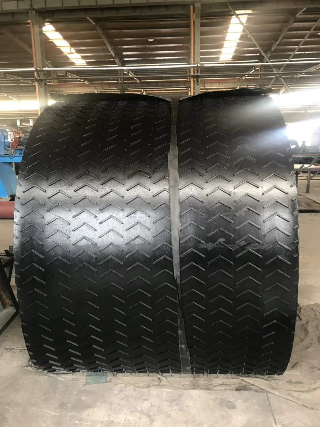 一產品用途:花紋輸送帶是由工作面為花紋狀的覆蓋膠和非工作面為平面的覆蓋膠與帶芯構成的傾角輸送帶。帶面上有高于帶體的“人”字型花紋,花紋可是開口的也可是閉口,每一種花紋可分為(高、中、低)。