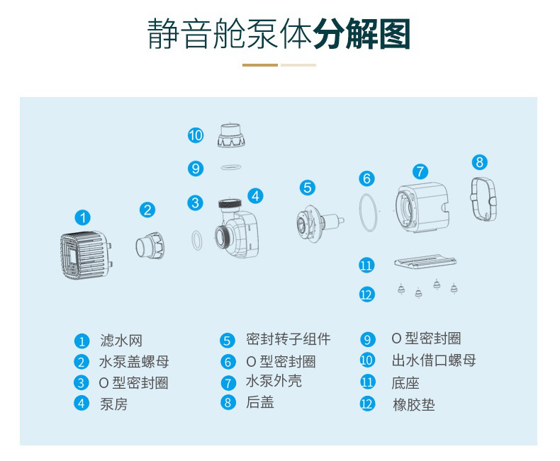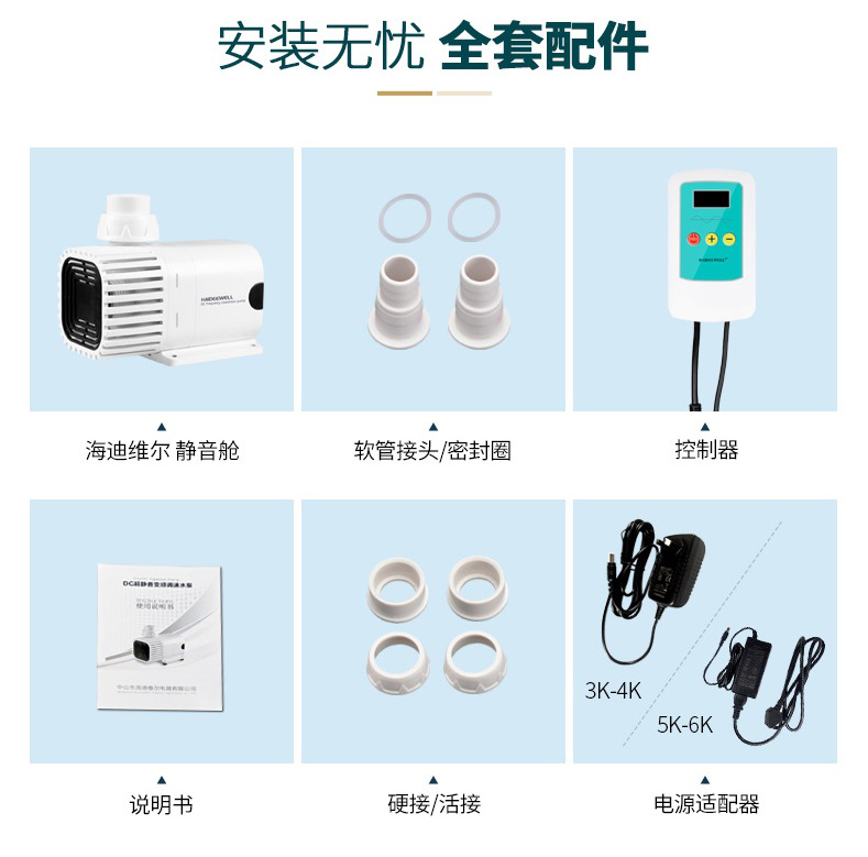 4、 大流量、高揚程:水族專用無刷變頻6槽電機,動力強勁;全封閉降噪水葉,減少水損,增強水量;