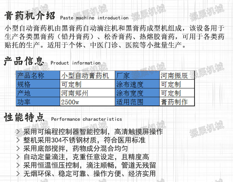 以上是河南振辰機械設備有限公司廠家直供全自動滴注機適合生產各種基質 小型膏藥機廠家批發 黑膏藥熬制的詳細信息,如果您河南振辰機械設備有限公司廠家直供全自動滴注機適合生產各種基質 小型膏藥機廠家批發 黑膏藥熬制的價格、廠家、型號、圖片有什么疑問, 請 聯系供應商 或 請供應商聯系我