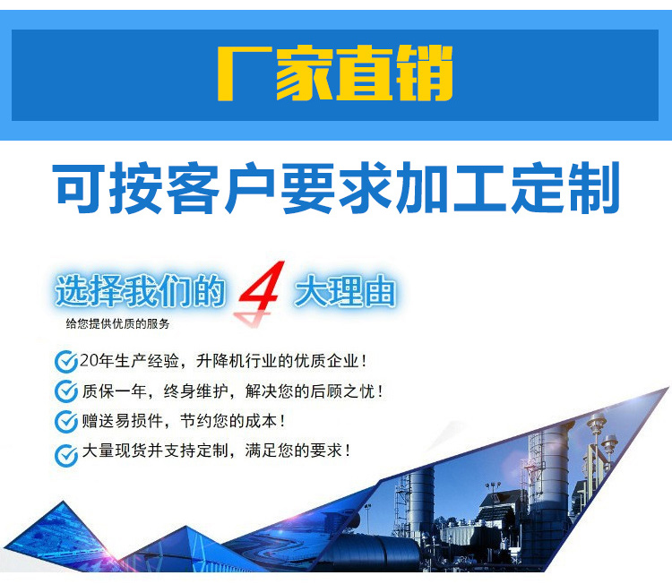 公司生產(chǎn)設(shè)備精良,工藝先進(jìn)合理,檢測手段齊全,技術(shù)力量雄厚,采用國內(nèi)外尖端液壓技術(shù);產(chǎn)品共有六大系列、二十多個(gè)品種,承接各種非標(biāo)產(chǎn)品及防爆升降設(shè)備設(shè)計(jì)和制作,規(guī)格型號(hào)齊全,質(zhì)量保證。廣泛用于建筑業(yè)室內(nèi)外裝修、車間、車站碼頭、...