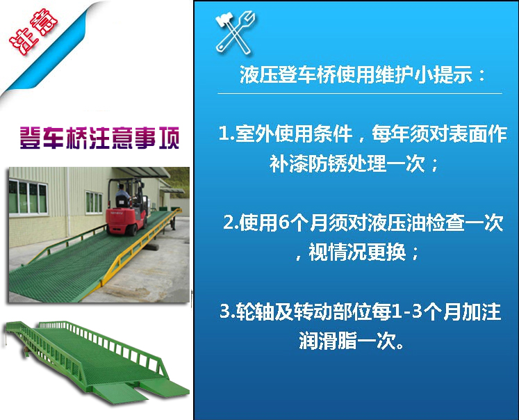 移動式液壓登車橋是與叉車配合使用的貨物裝卸輔助設備,可根據汽車車廂的高低調節高度,叉車可以直接通過本設備駛入車廂內部進行貨物的批量裝卸,僅需單人作業,即可實現貨物的快速裝卸。它使企業減少大量勞力,提高工作效率,獲取更大經濟效益。