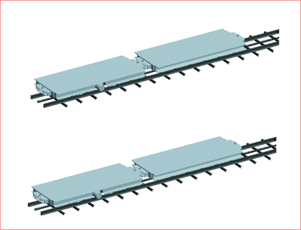 液壓自移式平板車上面安 裝固定設備后,其首尾通過連接板順次連接,行走軌道通過中間段連