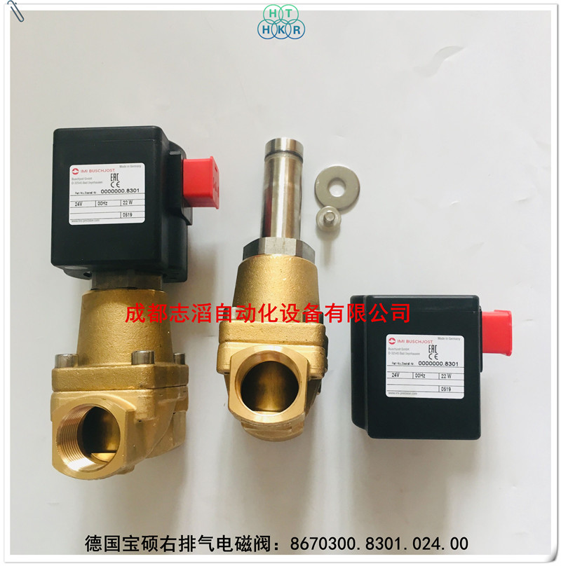8670300.8301.024.00德國寶碩imi(buschjost)電磁閥技術參數:接管口徑g3/4、通徑20mm、kv值為6.5立方米/h、工作壓力0-25bar、閥體重量1.8kg、配寶碩普通線圈8301、線圈電壓為24v直流!!、產地為德國、應用在軌道交通設備!