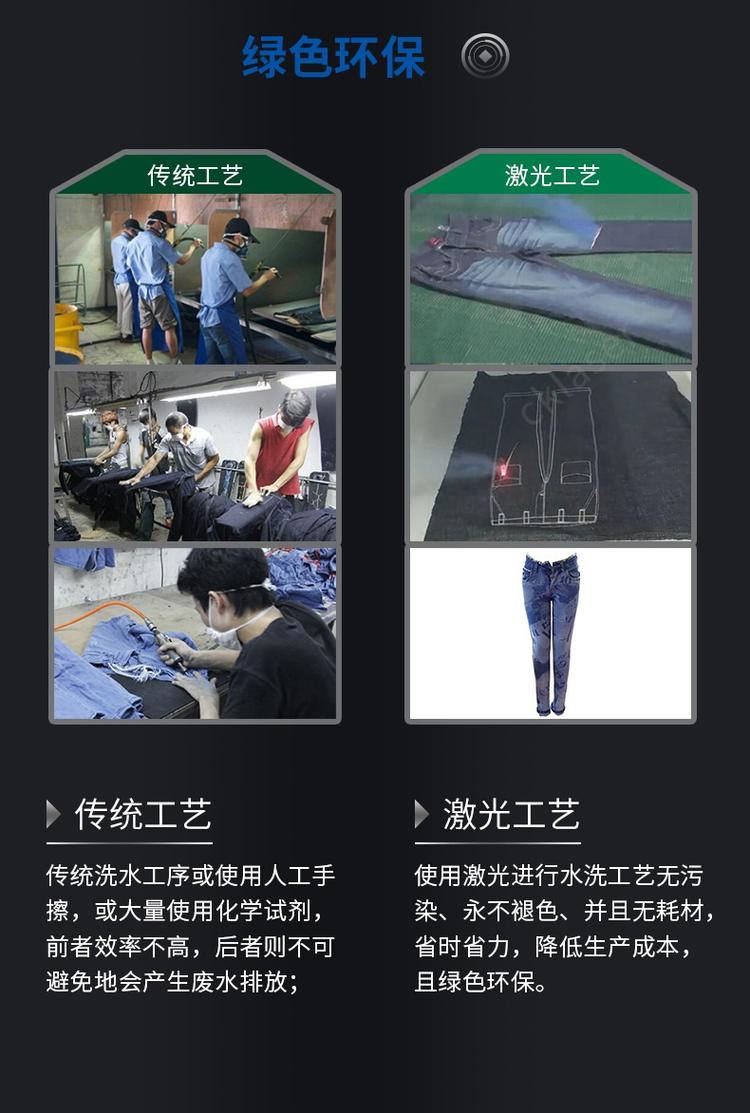 傳統(tǒng)洗水工序或使用人工手擦,或大量使用化學(xué)試劑 ,前者效率不高,后者則不可避免地會(huì)產(chǎn)生廢水排放;使用激光進(jìn)行水洗工藝無(wú)污染、不褪色、并且無(wú)耗材,綠色環(huán)保