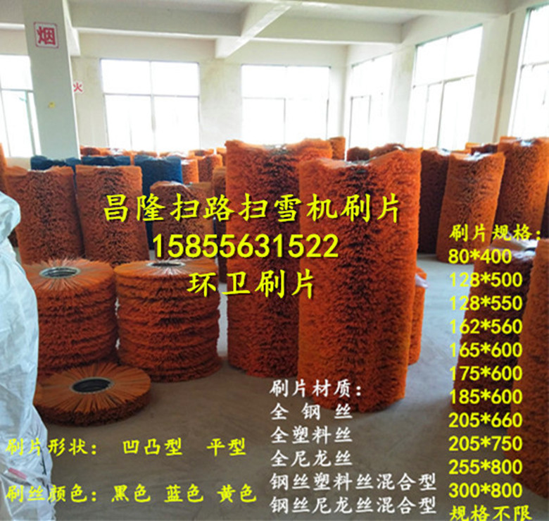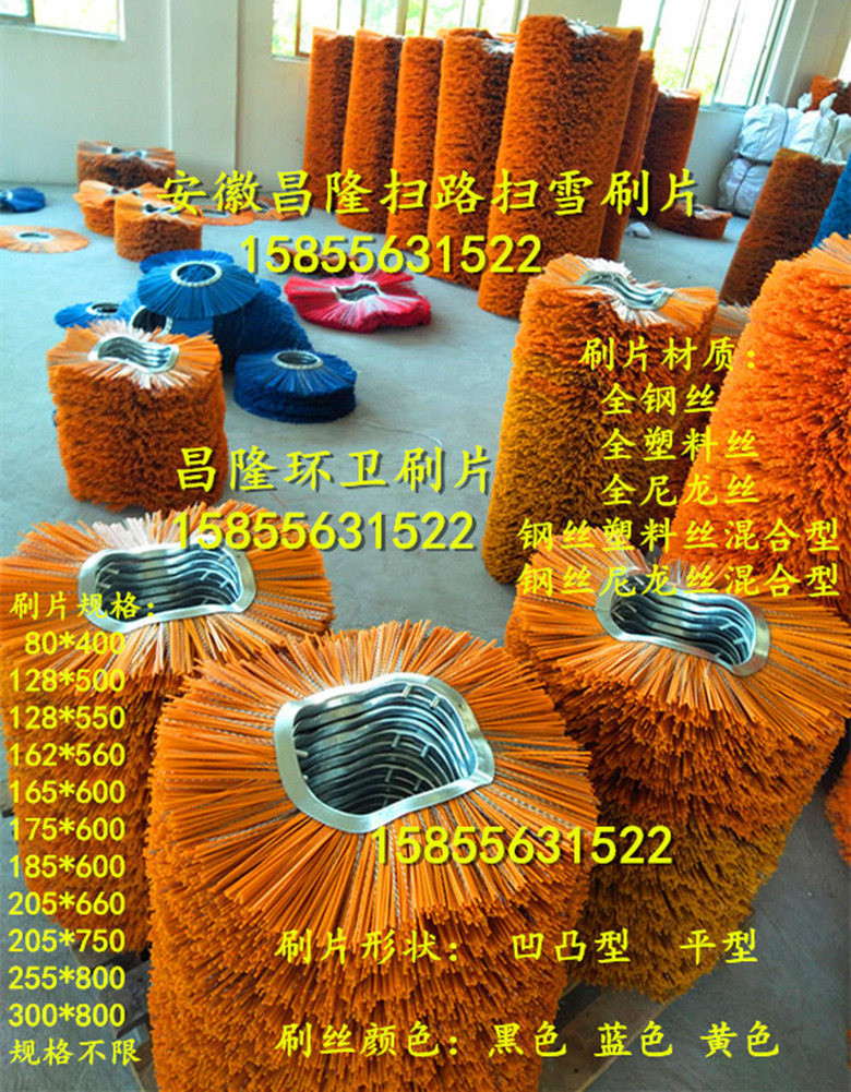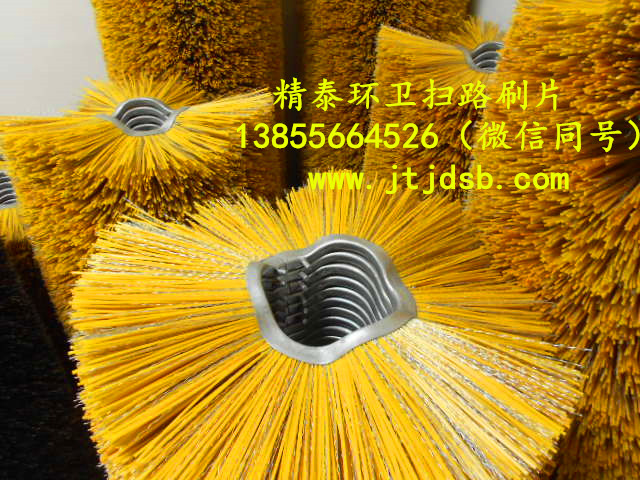 掃路刷掃雪刷護欄刷環衛刷生產廠家-安 徽精泰環衛刷有限公司生產的掃路車掃雪車毛刷片,是生產各類掃路掃雪刷片及刷輥的毛刷廠家!掃雪刷輥價格實惠!掃雪刷輥質量!產品適用于德國施密特、威海廣泰、武漢九通、沈陽德通、美國mb掃雪車、山東匯強等廠家生產掃雪車的掃雪滾刷更換,可為各大掃雪車廠家的配套,產品銷往北京、哈爾濱、沈陽、長春、新疆等地,也為空軍各大機場服務。精泰掃路掃雪刷片采用進口尼龍刷絲、鍍鋅鋼絲和pp絲等材質,強度高、抗磨損、耐腐蝕、特別是能在超低溫氣候下工作。主要用于國內外各種掃雪車,裝載車,滾刷片常用規格有:內徑128,外徑500,內徑162,外徑550,內徑165,外徑600,內徑205,外徑660,內徑208,外徑670,內徑255,外徑800,內徑300,外徑900,內徑500,外徑1500等規格,可按客戶要求,刷絲有pp絲和pp絲和鋼絲混合。掃雪刷片采用pp絲+彈簧鋼絲組合材質設計的滾刷,不掉毛、不斷毛、耐磨、不損傷路面且掃雪效果好,精泰掃雪刷片能在超低溫氣候條件下長時間掃雪不折斷,彈性好。精泰掃路刷片掃雪刷片質量已得到廣大客戶的認可了,具有耐磨抗高溫等特點,產品質量實行三包,價格從優,歡迎新老來人來電洽談訂購!