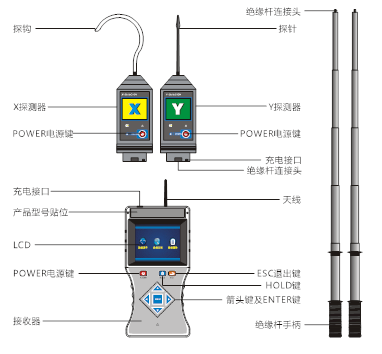 電壓:1kv~35kv頻率:45hz~75hz0.1°;0.1hz;1v相位:≤±10° 電壓:±15%±5dgt(1kv~35kv,高壓架空線路,其它應用誤差±25%±5dgt)頻率:≤±2hz 同相:-30°~30°;異相: 90°~150°和210°~270°同相、異相、x信號正常、y信號正常等語音功能拉伸后長約3.2m;收縮后長約0.6m9999組接觸核相:35kv以下裸導線,或110kv以下有安 全絕緣外皮的導線直接接觸核相。(帶絕緣桿操作)非接觸核相:35kv以上裸導線,或110kv以上線路采用非接觸核相,逐漸靠近該導線。(帶絕緣桿操作)輔助接地線測量:低于100v時,如果測量結果不穩定,則需要使用輔助接地線與接地點相連接,增強信號探測器“嘟--嘟--嘟”蜂鳴聲自動換檔2次/秒探測器:長寬厚145mm×60mm×48mm接收器:長寬厚250mm×100mm×40mm按上下箭頭鍵調整背光亮度根據感應的電場強不同,探測器能自動控制放大倍數,便于排線密集場所核相。