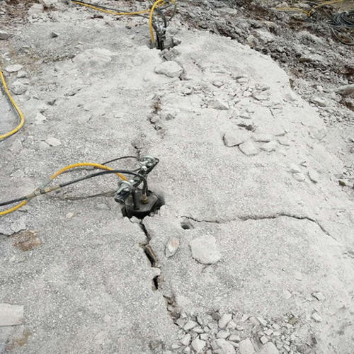 3、插入劈裂機,依斷裂層破拆。 液壓劈裂機破拆法的經濟消耗為:電費 人工工資 機械耗損;而破碎錘作業基本上都是選取“租賃機械帶操作人員”的方式,其經濟消耗為高租賃費,柴油能源的消耗。經過發潤的試驗取樣,液壓劈裂機破拆法的經濟消耗只有破碎錘的15%。從施工效果上來講,在同樣的石方破拆工程上,一臺破裂機的效率是破碎錘的2倍。在破碎錘敲打巖石時,破碎錘會反彈過來,沒有起到破碎作用。而劈裂機是大塊大塊的劈石頭。也就是說,液壓劈裂機破拆法是一個經濟的方法。
