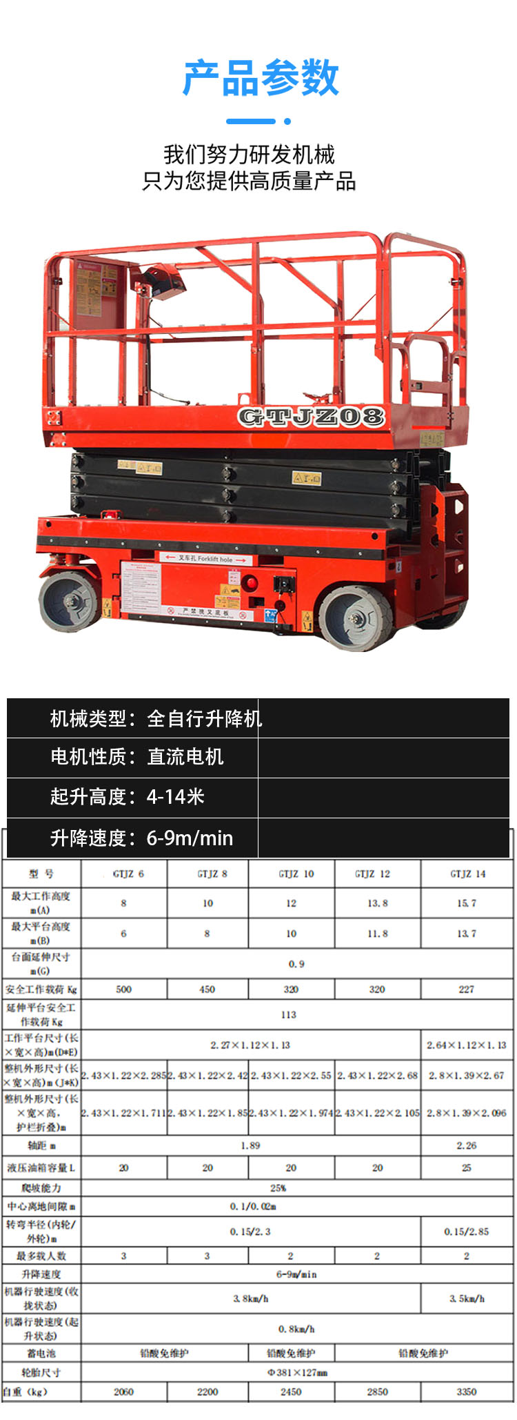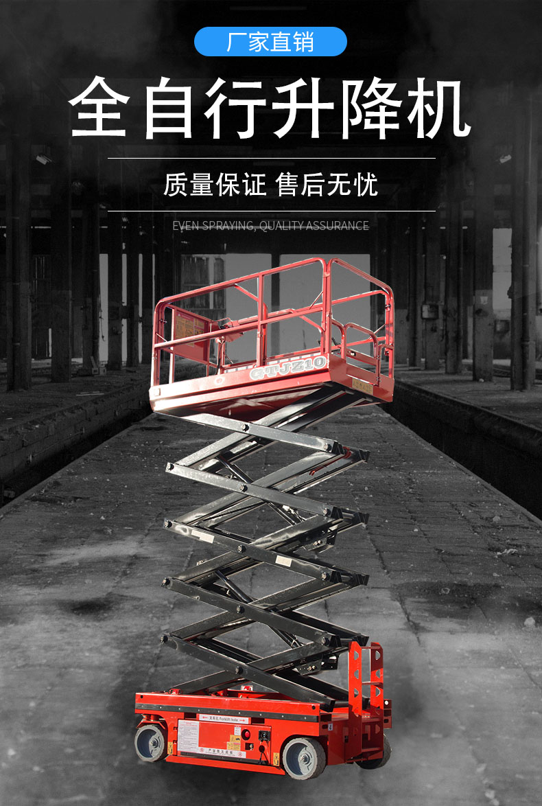 全自行平臺結構堅固,使升降平臺的偏轉與擺動極小。具有自動行走功能,采用電瓶控制行走,能夠在不同工作狀態下,不需外接電源,手柄控制行走, 行走速度可調,移動靈活、操作方便、升降自如,只需一人便可完成前進、后退、轉向、快、慢速行走和上下等動作,省工、省力。可根據用戶使用要求設計生產。