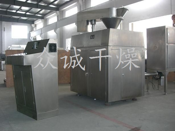 干法制粒機是將混合好的含有一定結晶水,干的粉 末物料(西藥或中藥提取物),倒入錐形料斗,通過異形不等距錐形螺桿的向下旋轉送料產生預壓力,使物料被壓縮、除氣,并且均勻地分布在二個壓輪的表面上,到咬合區,然后被具有一定擠壓推力的二個壓輪咬入,先擠壓成溥片,再切碎、至制粒系統中造粒的一個過程。