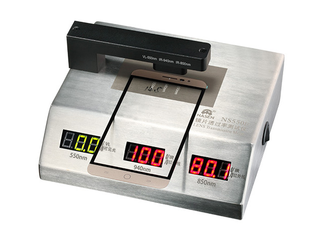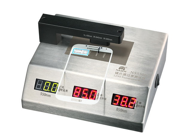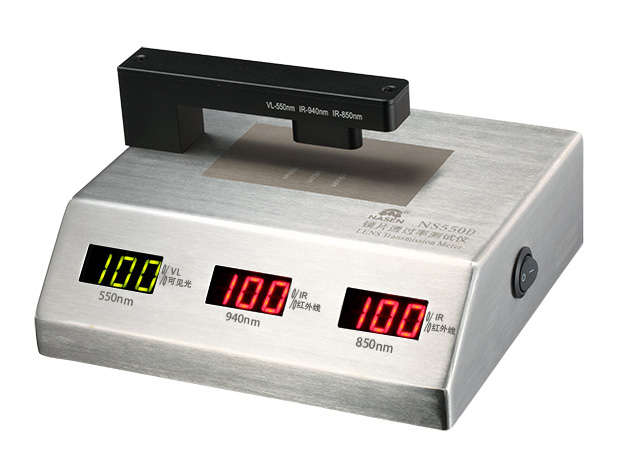 ns550d的測試原理是采用紅外850nm光源,紅外940nm光源和可見550nm光源照射被測透明物質,感應器分別探測三種光源的入射光強和透過被測透明物質后的光強,透過光強與入射光強的比值即為透過率,用百分數表示。