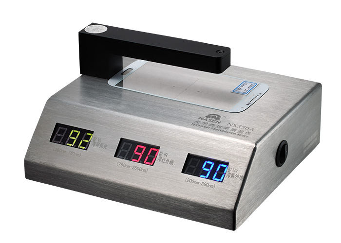 ns550a的測(cè)試原理是采用紫外光源,紅外光源和可見光源照射被測(cè)透明物質(zhì),感應(yīng)器分別探測(cè)三種光源的入射光強(qiáng)和透過(guò)被測(cè)透明物質(zhì)后的光強(qiáng),透過(guò)光強(qiáng)與入射光強(qiáng)的比值即為透過(guò)率,用百分?jǐn)?shù)表示。