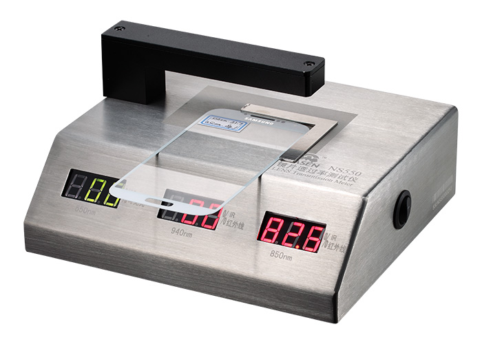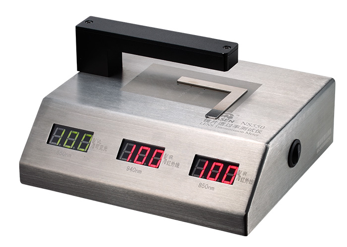 ns550鏡片透過率測量儀的測試原理是采用紅外850nm光源,紅外940nm光源和可見550nm光源照射被測透明物質,感應器分別探測三種光源的入射光強和透過被測透明物質后的光強,透過光強與入射光強的比值即為透過率,用百分數表示。
