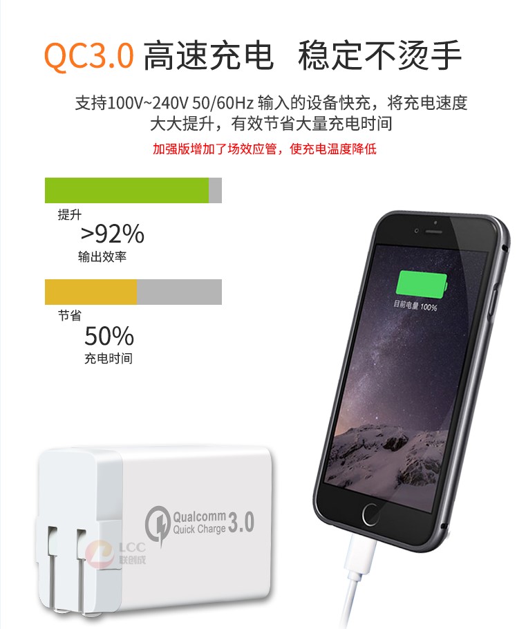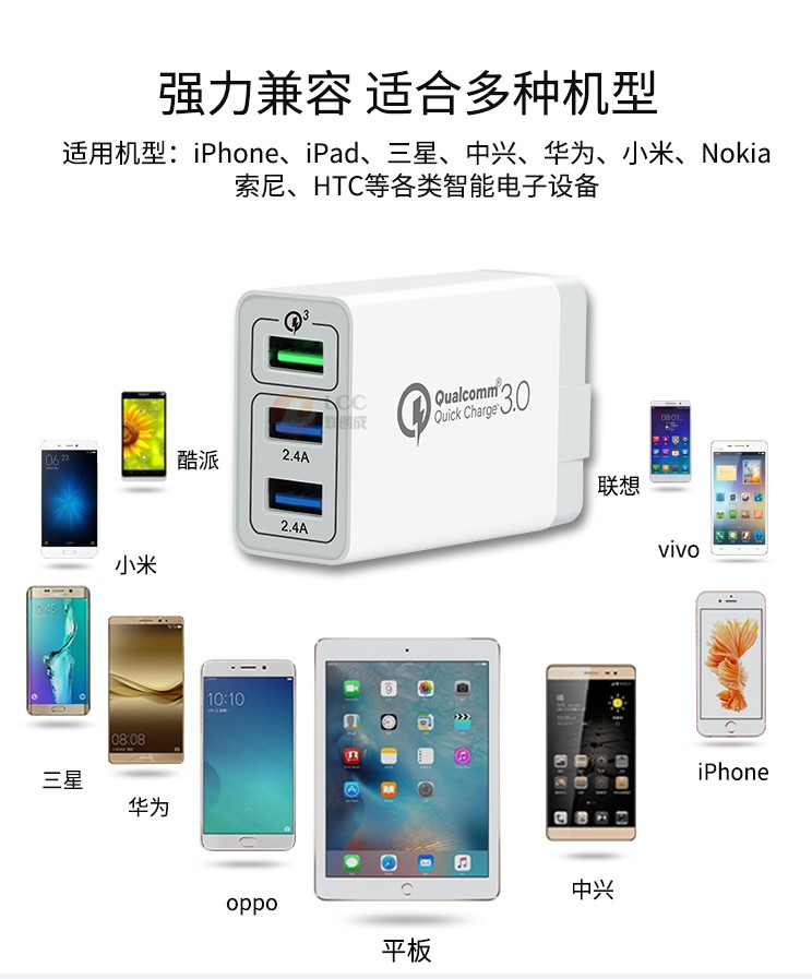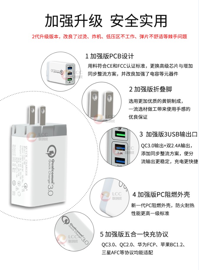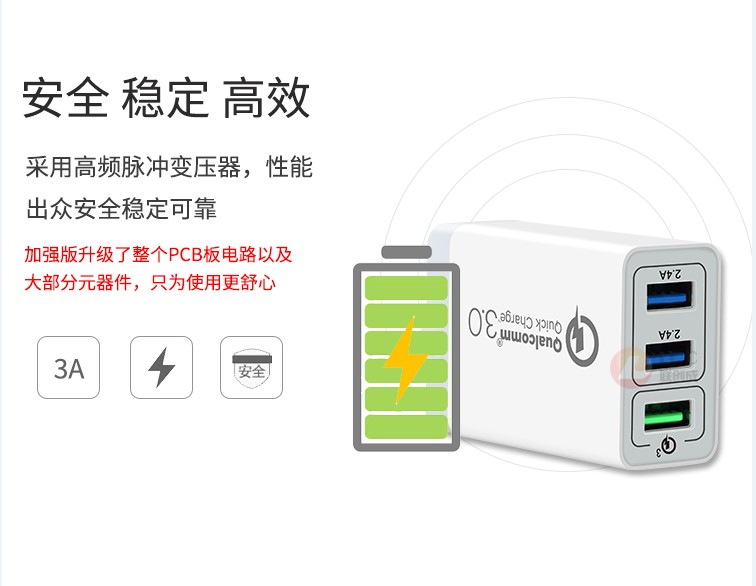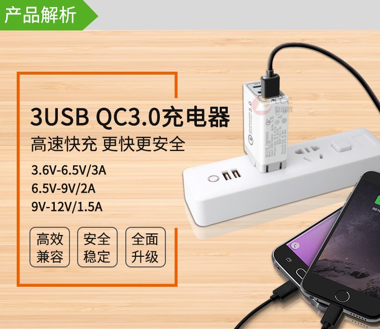 產品優勢:支持qc3.0快充技術,qc3.0+2usb 2.4a穩定輸出,不跳屏;