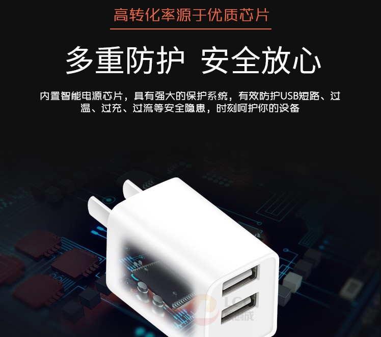 產(chǎn)品功能:支持2臺設(shè)備同時充電,智能ic自動適配電流充電(根據(jù)手機所需電流決定);