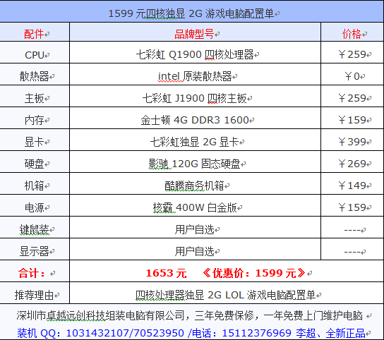 深圳市卓越遠創科技組裝電腦有限公司,深圳市華強北組裝電腦有限公司,深圳華強北diy組裝臺式電腦批發,深圳市南山組裝電腦批發,深圳市龍華組裝電腦批發商城,深圳市龍崗組裝電腦批發,深圳市羅湖組裝電腦批發商城,深圳市組裝電腦全程免費送貨上門,三年免費保修,一年免費上門維護電腦,原裝正品,假一賠十,誠信經營,質量第一,本公司主要:diy組裝臺式電腦,組裝服務器,品牌臺式電腦,辦公耗材批發,電腦維修,電腦配件批發。以下給大家介紹一款四核游戲電腦配置,辦公用也可以,運行速度快,打開瀏覽器快,多開qq不卡機。如有需要更改,請聯系我們的工作人員