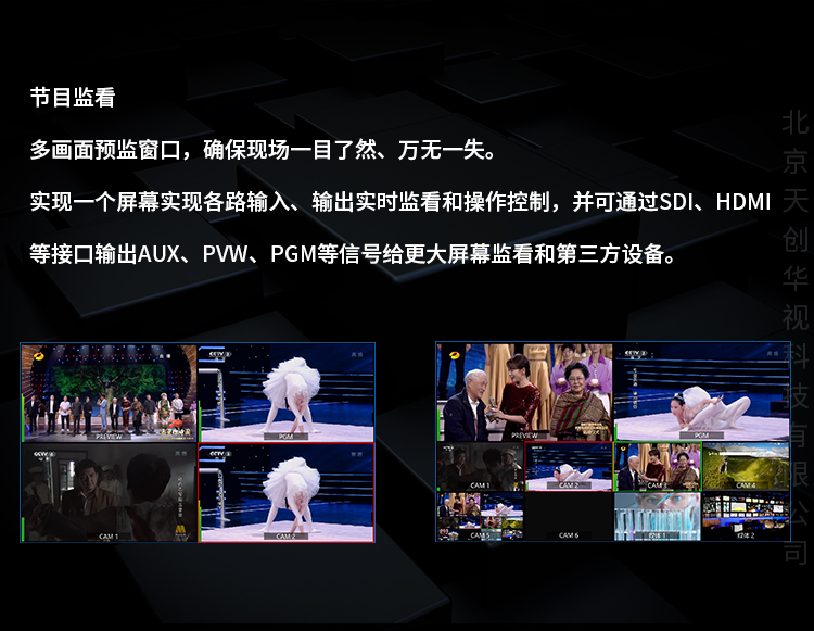 4.節目監看:多畫面預監窗口,確保現場一目了然、萬無一失。一個屏幕實現各路輸入、輸出實時監看和控制操作,并可通過sdi、hdmi等接口輸出aux、pvw、pgm等信號給更大屏幕和第三方設備