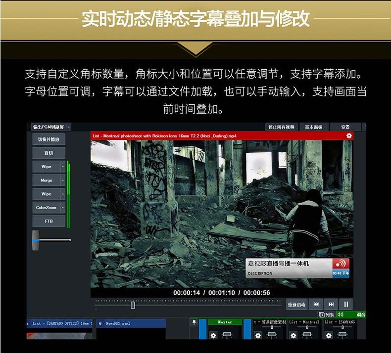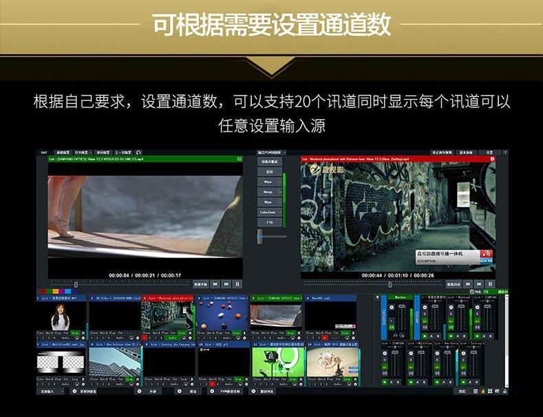 支持防鋸齒功能開關,任意畫面旋轉邊緣無任何鋸齒,支持左飛,右飛,上滾,下滾,秒表字幕制作,支持windows系統和macos 10.8+系統,方便后期遷移。支持宏指令自動操作,可設定宏指令操作,多組動作自動記憶,綁定快捷鍵自動執行;支持實時圖層混合模式,包括變暗,正片迭底,顏色加深等不低于15種方式。具有實時功能,美顏,老電影,光暈,模糊,色彩校正,隔離顏色等不低于30種。具備實時可視化虛擬編輯軟件,具備實時可視化字幕編輯軟件,文字可實時轉換為貝塞爾路徑,方便異性文字制作,筆畫修改,支持對輸入信號和本地素 材進行無規則裁剪,任意異形