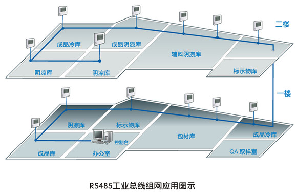 本系統主要針對多點(推薦六點位以上)環境和設備內溫度、濕度的集中監控和管理,是一套可無人值所24小時不間斷實時監控記錄的自動化監測系統。系統能對大面積的多點的溫濕度進行監測記錄,并將溫濕度數據實時傳輸到pc機上,利用系統監測軟件進行數據存儲與分析,并輸出打印歷史數據和曲線圖,在設備異常情況下還以現場多媒體音響、聲光報警器、電話報警、手機短信息報警、網絡客戶端報警等多種形式的通知相應監管人員。克服了以前靠管理人員手工檢查、測量和手工計算溫度值和濕度值,提高了倉庫溫度和濕度的檢測速度和檢測精度,節省了大量人力和物力,減輕了溫濕度管理的工作強度,提高了管理效率,圖1-1所示為485組網示意圖