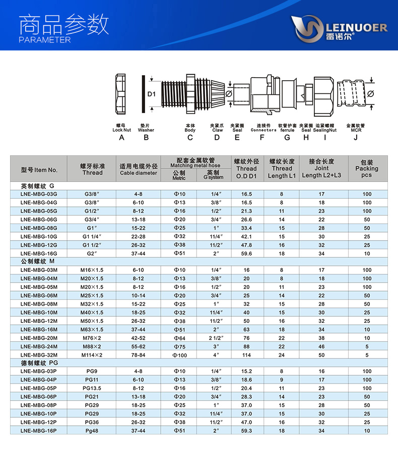 配套鎖式電纜接頭,防電線松動,內鎖扣合本體特殊設計,裝卸只需拔插無需工具,大大縮減了安 裝時間,夾緊電纜范圍大,抗拉力特強,產品有耐酸 堿 、耐化學物質與一般溶劑 等抗腐蝕特性,可防水、防塵 全方位的尺寸可廣泛應用于各個領域的出線孔上。