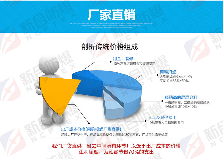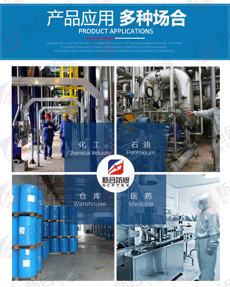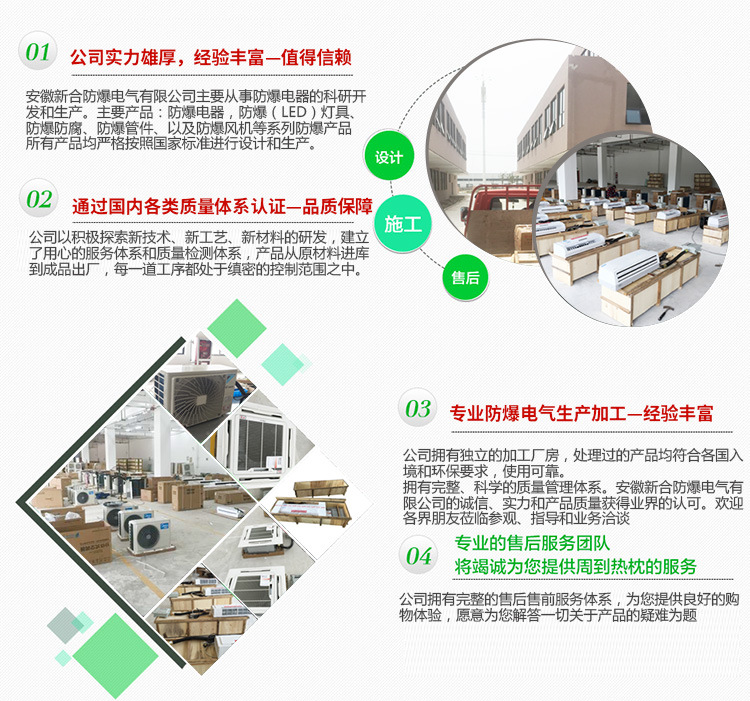 安 徽新合防爆電氣有限公司主要從事防爆電器的科研開發_和生產。主要產品:防爆電器,防爆(led)燈具、防爆防腐、防爆管件、以及防爆風機等系列防爆產品 。對發_展,公司秉承“敢于創新、誠信務實、質量第一”的理念,所有產品均嚴格按照國家標準進行設計和生產,并以設計造型美觀、檢修方便、配套功能齊全、廣泛應用于石油、化工、鋼鐵、冶金、礦山、消防及燃氣、鐵路、電力、部隊等各個領域。 對員工,公司恪守“人性至上、成就有意愿的人、讓大家有尊嚴的生活為根本,充分引爆人人潛力,讓每個人自信工作的同時,快樂的獲得財富,獲得成長”。 對客戶,公司承諾“讓客戶買的有尊嚴的三不承諾:1、不亂報價格,誤導客戶!2、不拖延貨期,耽誤客戶使用!3、售后服務問題不逃避,1個小時內給出讓客戶滿意的答案! 公司以積極探索新技術、新工藝、新材料的研發_,建立了用心的服務體系和質量檢測體系,產品從原材料進庫到成品出廠,每一道工序都處于縝密的控制范圍之中。公司始終密切關注和跟蹤防爆行業的發_展動態,不斷地進行技術升級改造,保持產品工藝技術與加工檢測設備的先進性。 新合防爆實施雙贏合作戰略,在競爭激烈的市場經濟環境下,與廣大經銷商和供應商通力合作,廣泛建立戰略合作聯盟,實現優勢互補,雙贏誠信經營的共同發_展。 新合防爆著力于以人為本,以客戶為中心的管理團隊、專業化員工團隊、專業服務中心及專業服務部。營銷和服務網絡已覆蓋全國市場,能夠對客戶的需求、期望和滿意持續的保持,并承諾在1小時內為客戶提供高績效、專業化和敏捷性的售前、售中及售后服務!