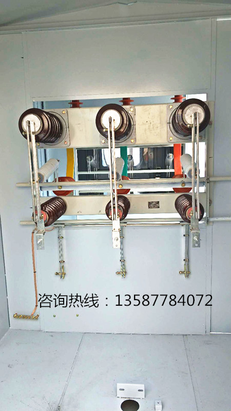 b、開關室由密封在金屬殼體內的各個功能回路(包括接地開關和負荷開關)及其回路間的母線等組成。殼體由3㎜冷軋鋼板(或不繡鋼板)焊接而成。每一個功能回路包括一臺負荷開關和接地開關。負荷開關是由垂直運動的動觸頭系統和位于下端的靜觸頭組成,開關合閘時,動觸頭向下運動,負荷開關接通。接地開關由動觸刀和靜觸刀組成,在彈簧運動過程中,接地開關快速接通。開關室上部和后部開有4個長方形裝配工藝孔,環網柜的正面裝有觀察窗,可看到接地開關的“分”、“合”位置。在環網柜的后部裝有防爆裝置。