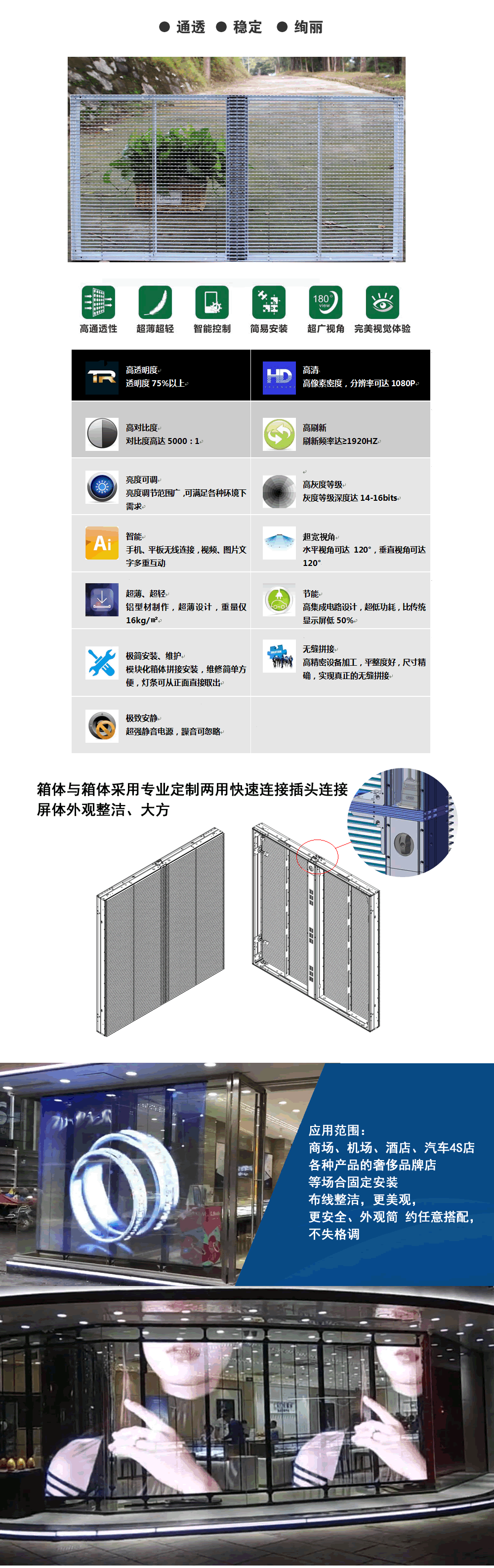 產品主要應用于室內環境,如:大型商場、連鎖店、企業展廳、酒店大堂、數據中心,舞臺美術等等。其獨有的高通透顯示技術75%以上高通透率,隱性安 裝,完美顯示,不影響樓宇外形,不影響室內采光等優勢,屏體不點亮時,幾乎不影響整體外觀設計和建筑通透采光,而點亮后,玻璃變成led屏,可以播放圖文視頻,而且色彩絢麗,畫面逼真,自帶輕3d效果是高科技與藝術性的完美結合又廣泛應用在戶外寫字樓玻璃幕墻、購物中心,旅游景區等等。