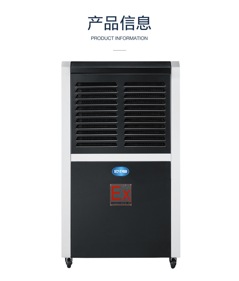 宏中格防爆除濕機是為存在或可能存在級別為iia、iib級,溫度組別為t1~t4組可燃性氣體、蒸汽與空氣混合形成的性氣體,并有空調除濕要求的場所設計的特種除濕設備 。