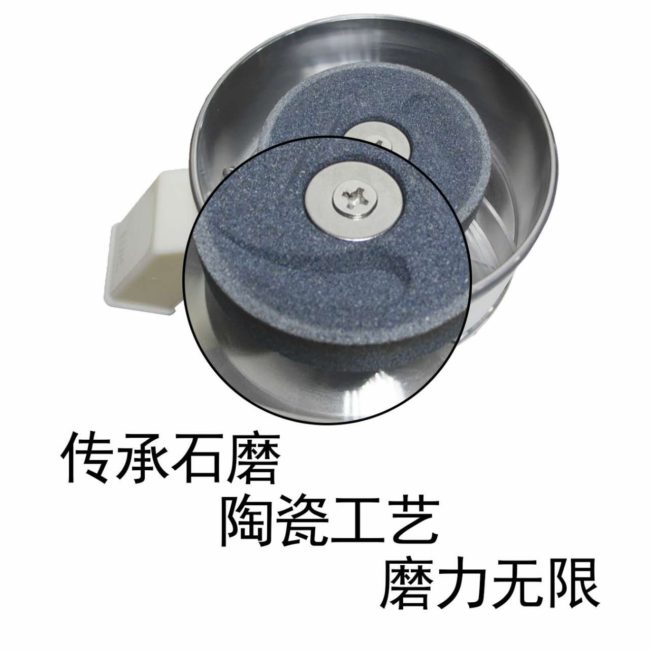機身里面裝置的上下兩個磨盤,一靜一動完美配合、精細研磨,全國獨家的專用304不銹鋼撥片避免磨出的優質芝麻 醬在料斗中造成堵塞粘黏無法出料。