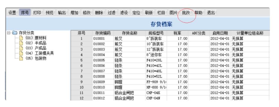 1、依次點擊【基礎檔案】-【存貨】-【存貨檔案】,點擊【批改】按鈕;