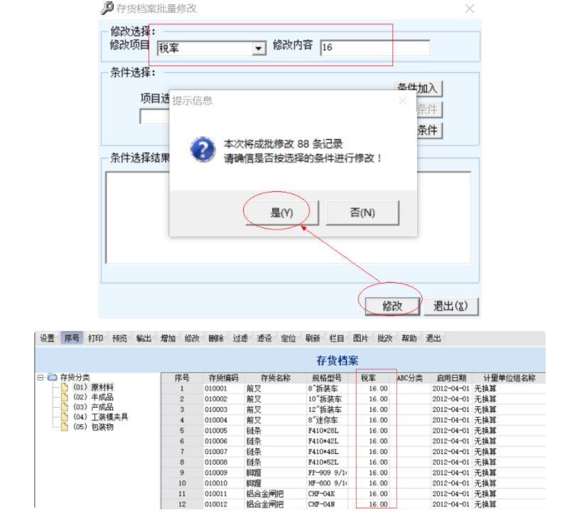 2、在【存貨檔案批量修改】的界面中:【修改項目】選擇【稅率】,【修改內容】中輸入正確的稅率值,最后點擊右下方的【修改】按鈕即可全部修改成功。