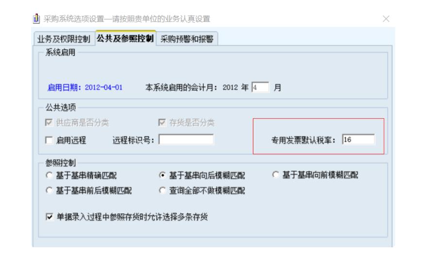 2、依次點擊【采購管理】-【設置】-【其他設置】-【采購選項】,在【公共及參照控制】頁簽 下修改【專用發_票_默認稅率】的值;