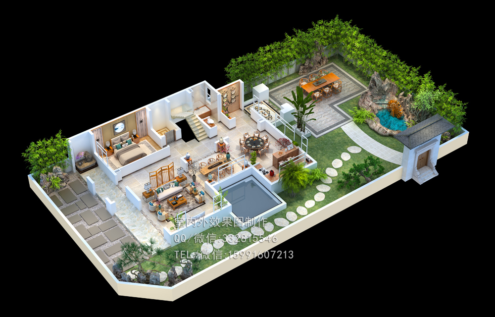 關于地產類室內戶型圖鳥瞰這塊,我們寫了很多文章了。躍層,復式,標準平層3d戶型效果圖的制作案例,也比較多。其實這類項目,做的話還算容易入手,難點在于素 材的積累,燈光的配合,模型的創建。公司的很多新同事,對于別墅,尤其是上疊,下疊別墅這塊模型的搭建不是很好理解。