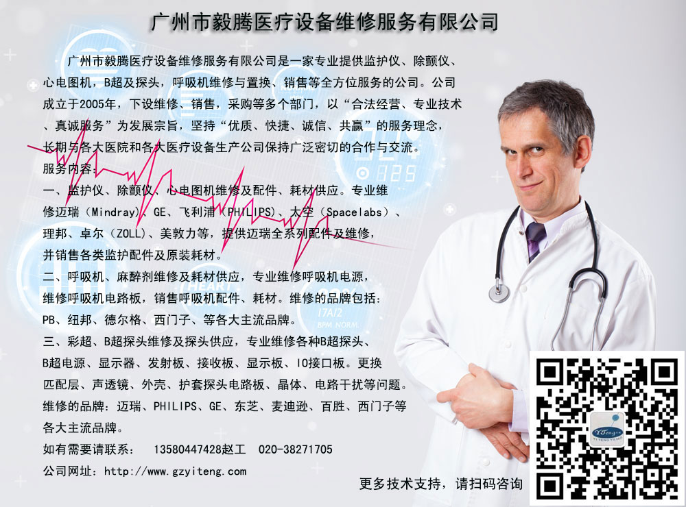 廣州市毅騰醫療設備維修服務有限公司是一家專業提供監護儀、除顫儀、心電圖機,B超及探頭,內鏡,攝像系統,呼吸機維修與置換、銷售等全方位服務的公司。公司成立于2005年,下設維修、銷售,采購等多個部門,以“合法經營、專業技術、真誠服務”為發展宗旨,堅持“優質、快捷、誠信、共贏”的服務理念,長期與各大醫院和各大醫療設備生產公司保持廣泛密切的合作與交流...