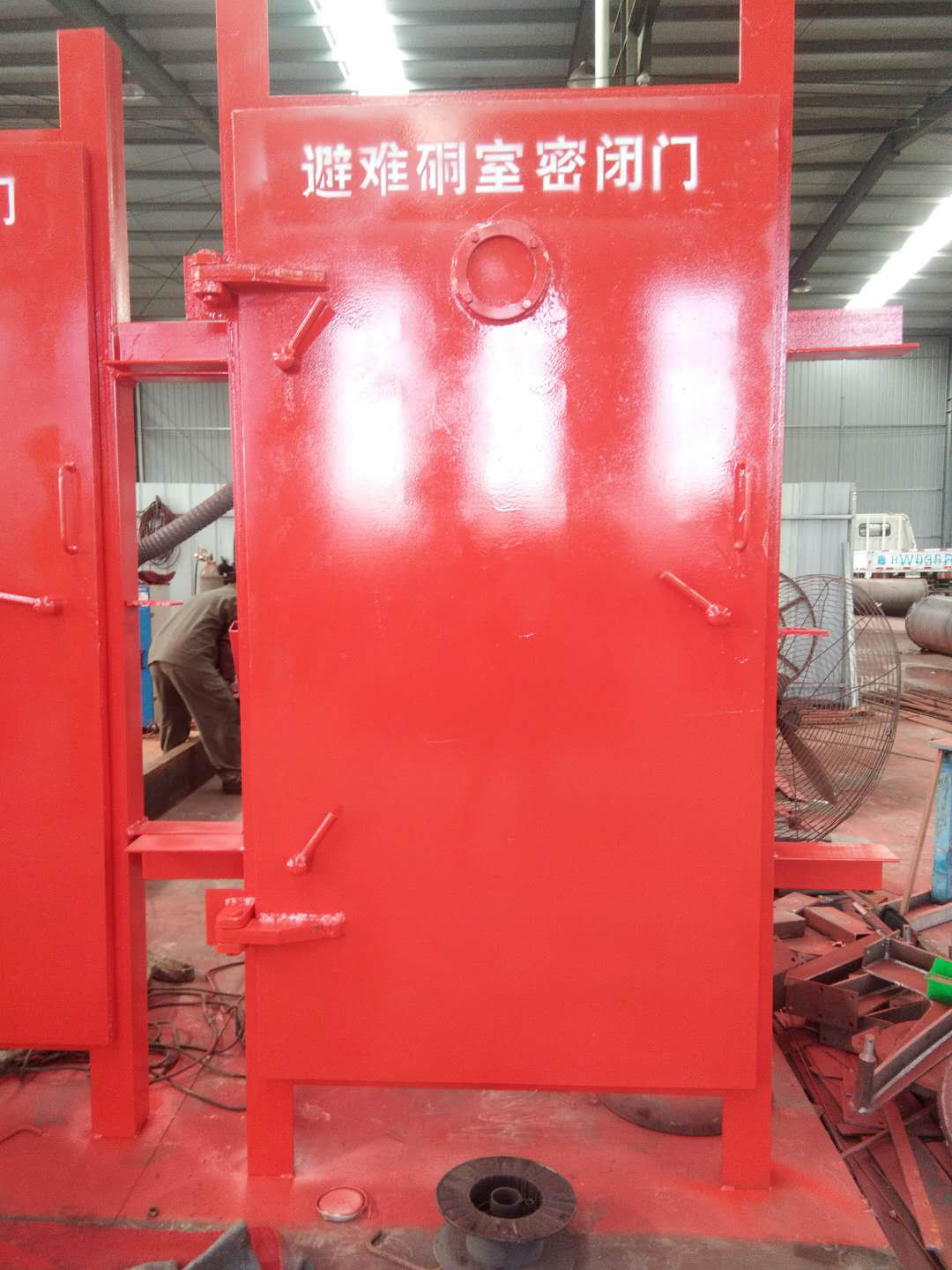 1、外門(避難硐室防爆門):該門為弧形門,采用薄殼液壓成型工藝,將平板型的防爆門沖壓成具有一定的弧度。成型后能承受更大的沖擊力,并在便面噴涂耐高溫的面漆。主要的作用是防爆、抗沖擊波。