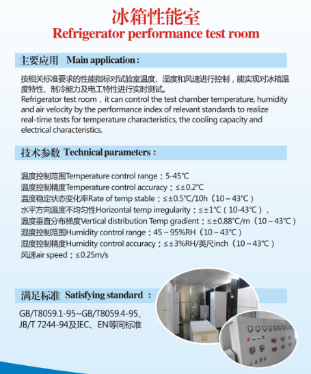 我司的國家級用能產品檢測實驗室,下設有冰 箱性能檢測實驗室,可以檢測家用電冰 箱、酒店冰 箱、冷藏冷凍箱、冷凍箱、紅酒柜等產品的耗電量、儲藏溫度、冷凍能力、負載溫度回升、冷卻速度、制冰 能力、凝露試驗進行技術測試。