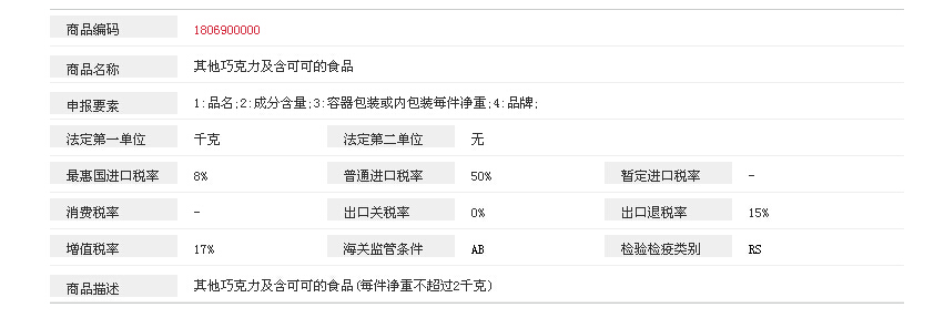 商品描述:其他巧克力及含可可的食品(每件凈重不超過2千克)