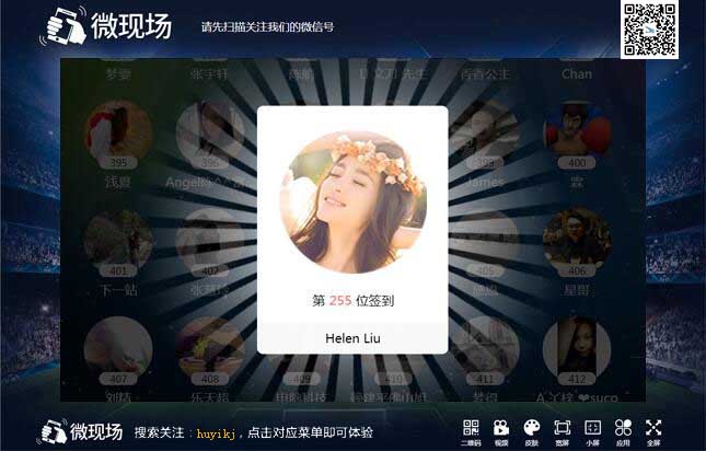 消息墻——個性的簽 到效果,所有完成簽 到參與者微信頭像及呢稱將全部實時顯示到消息墻上,在需要展示的時候可以用所有頭像拼出企業logo或各種自定義圖形、形狀!