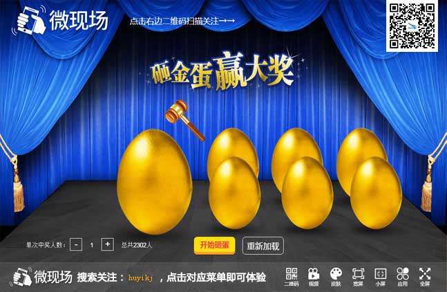 模擬現實砸金蛋形式的微信現場抽獎方式。觀眾簽 到后,大屏幕開始砸金蛋,砸碎蛋后,中獎者從蛋里飛出。