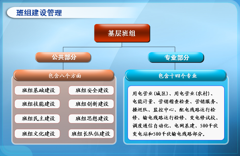 公司根據不同類型班組的特點,按照公司一流、標桿、星級班組的標準,將基層班組劃分為多個細小專業類型(專業可以靈活配置),并制定了班組專業考核細則(細則可維護),促進了班組專業技術標準化建設。