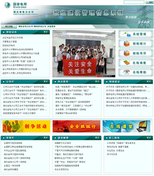 地市公司主頁共設置了十六個功能模塊,除與省公司相同功能的班組動態、圖片新聞、系統管理、班組統計、班組考評、在線調查、在線幫助、公告欄、制度建設、創爭活動、安 全班組行、在線課堂欄目外,其他依次為: