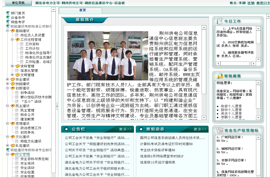 基層班組主頁共設置了七個功能模塊,依次為班組工作樹、班組簡介、近期工作、班組愿景、公告欄、班組動態、安 全生產經營指標。