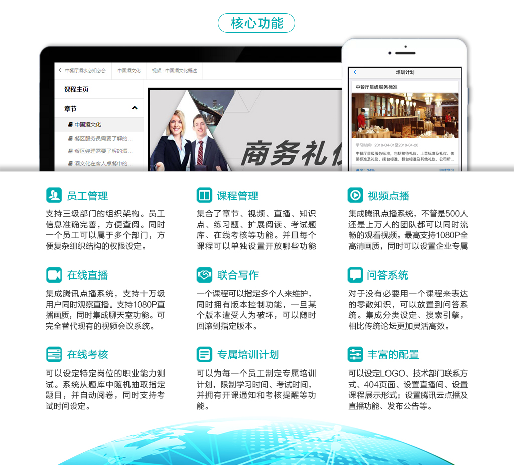 公司培訓(xùn)管理系統(tǒng)網(wǎng)埔e-training是青島同游網(wǎng)絡(luò)技術(shù)有限公司根據(jù)自身多年的教育平臺開發(fā)經(jīng)驗(yàn)以及深入調(diào)研企業(yè)培訓(xùn)需求后自主研發(fā)的一套針對企業(yè)內(nèi)部培訓(xùn)管理的專用軟件,可以讓企業(yè)將自身知識及培訓(xùn)資源進(jìn)行整合,形成線上課程(圖文、視頻、直播等形式),員工通過手機(jī)或電腦即可線上學(xué)習(xí)并完成考核。