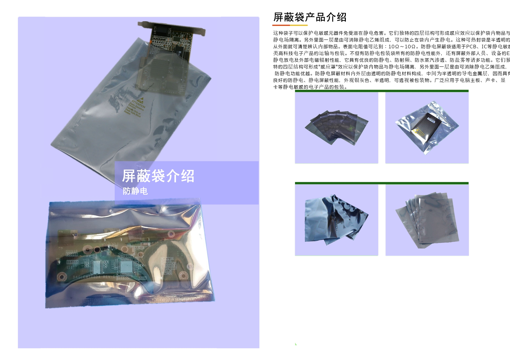 這種袋子可以保護電敏感元器件免受潛在靜電危害。它們獨特的四層結構可形成感應效應以保護袋內物品與靜電場隔離。另外里面一層是由可消除靜電乙烯組成,可以防止在袋內產生靜電。這種可熱封袋是半透明的,從外面就可清楚辨認內部物品。表面電阻值可達到:10ω~10ω。防靜電屏蔽袋適用于pcb、ic等靜電敏感類高科技電子產品的運輸與包裝。不但有防靜電包裝袋所有的防靜電性能外,還有屏蔽外部人員、設備的esd靜電放電及外部電磁輻射性能,它具有優良的防靜電、防射頻、防水蒸汽滲透、防鹽 霧等諸多功能。它們獨特的四層結構可形成"感應罩"效應以保護袋內物品與靜電場隔離.另外里面一層是由可消除靜電乙烯組成, 防靜電功能優越。防靜電屏蔽材料內外層由透明的防靜電材料構成,中間為半透明的導電金屬層,因而具有良好的防靜電、靜電屏蔽性能,外觀銀灰色、半透明,可透視被包裝物。可制作平口袋、拉鏈袋、風琴袋、立體袋等形式。廣泛應用于電腦主板、聲卡、顯卡等靜電敏感的電子產品的包裝;