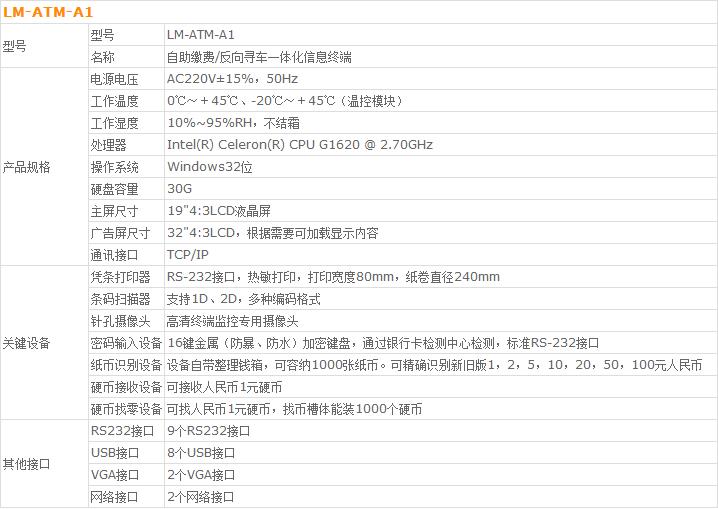 lm-atm-a1自助繳費機/反向尋車一體化信息終端專門針對金融行業、數字化城市、醫 療行業開發的非現金自助服務終端,通過觸摸方式,以友好的人機交互界面為客戶提供服務,該類產品外型美觀大方,具有國際級外觀專利,工藝考究,可擴展性強,集安 全性、可靠性、實用性為一身。