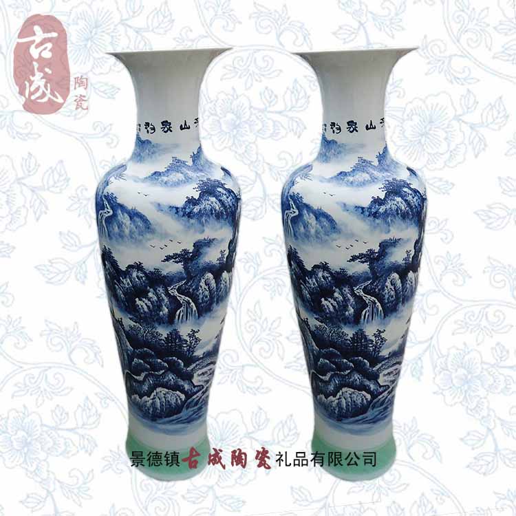 陶瓷大花瓶用于大廳、門廳、客廳等擺設,主要適合于開業禮品,大樓建筑落成、工程竣工開業、奠基典禮、酒店賓館陳設、企事業單位喬遷、周年紀念 、學校校慶、搬遷新居等。制作工藝為景德鎮純手工繪制,高白泥手工拉胚,高白釉上底色,整個生產工序要經過淘泥、摞泥、拉坯、修坯、繪畫、上釉、燒窯、成瓷等近七十道工藝之多,并可根據您的特殊需要在陶瓷大花瓶身上可燒制logo、公司名稱、人名、贈言,紀念用語,年月日等。