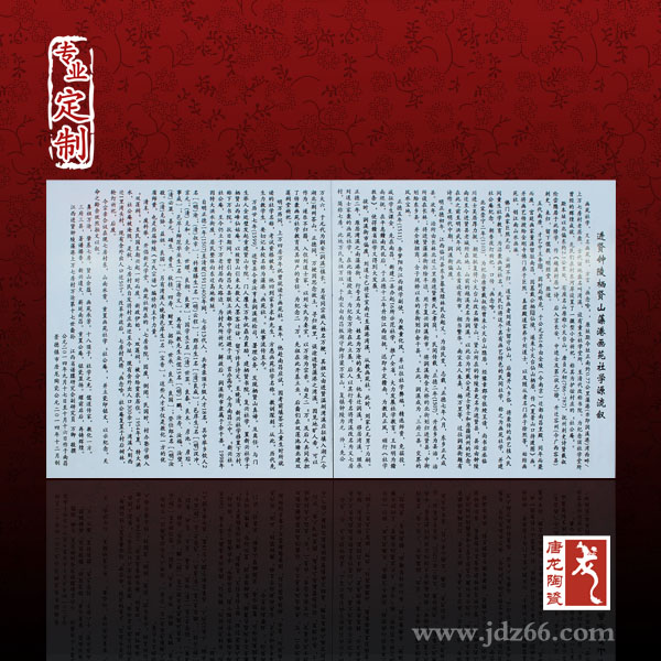 總結選擇景德鎮陶瓷板畫,優點多多:一、可按照客戶要求的圖案進行繪制或燒制;二、不受數量限制,任何數量都可以定制品;三、永不褪色,因為我們經過高溫燒制(這是和紙畫最大區別);四、強度高,我們是在經過1300度以上高溫燒制而成的瓷板上繪制的,在室內室外都不怕日曬雨淋或者鈍器劃刻。