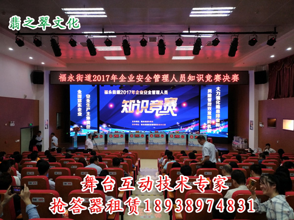 深圳市翡之翠文化傳播有限公司自08年成立以來一直致力于舞臺互動技術的研發(fā)。知識競賽搶答器系統(tǒng)、娛樂賽事評分系統(tǒng)、體育賽事計分系統(tǒng)等。目前均已成為全國同行業(yè)的領導品牌。知識競賽系統(tǒng)包括無線電腦搶答器、計分器、各組選手面前和大屏幕同步顯示比賽的題目、答案、倒計時、中場環(huán)節(jié)顯示各組的得分、各隊的最后分數(shù)排名。搶答模式包括多種。不論你想做一場多大規(guī)模的知識競賽活動我們都能滿足您的需求。從前期的現(xiàn)場設備安 裝調(diào)試到彩排、正式競賽、活動結(jié)束整個過程我們都有專業(yè)的技術人員全程跟進。以確保活動的順利進行。