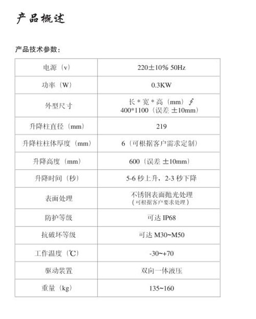 升降柱:通過手動鑰匙來鎖住或釋放升降柱,當設備處于升起狀態時,通過鑰匙釋放后人工腳踩下來,到位后自動鎖死,再次通過鑰匙釋放后會自動的升起,該類產品多使用在很少需要起降的場所。或者周邊沒有位置保安 力量的場所。主要 原因一是因為半自動省建筑成本低,二是因為半自動升降柱沒有控制板或控制柜防盜安 全性高。例如步行街、廣場等場所可以選用,另外在一些寬度較大的出入口可以配合全自動升降柱使用。